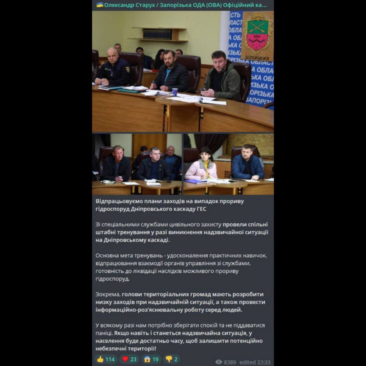 ⚡️The authorities of the Zaporizhzhia region inform about the development of plans in case of a breakthrough of the hydrostructures of the Dnipro Cascade of the HPP.