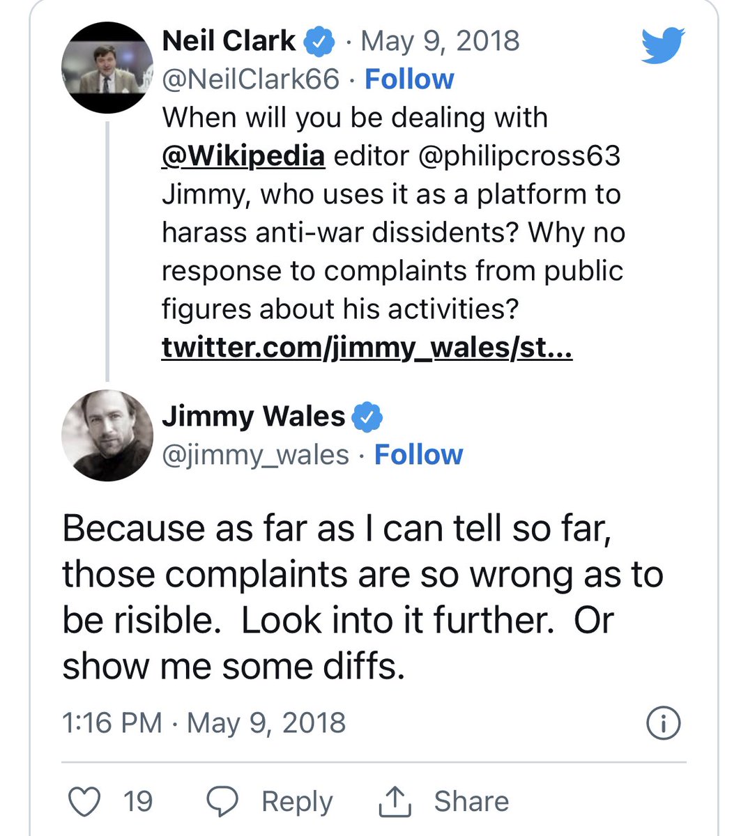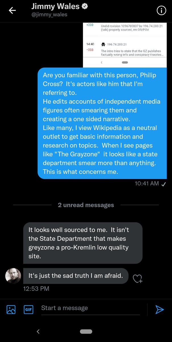 This was sent to me by an account I don’t know, so I’m not sure @jimmy_wales’ comments denigrating @TheGrayzoneNews are authentic. But his politics and defense of Phillip Cross, a suspect editor who has vandalized my personal Wikipedia page and The Grayzone’s, suggest they are.