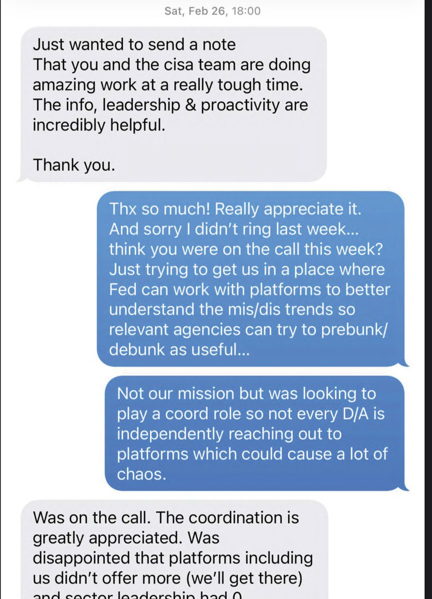 Here is a senior executive from Facebook texting Surgeon General Vivek Murthy to do damage control after Biden accused FB of "killing people" with misinformation. He thanks the "CISA team," referring to the DHS cybersecurity wing.