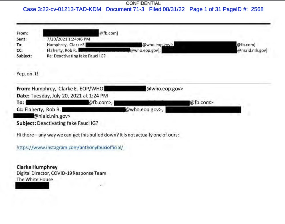 White House Covid-19 team digital director Clarke Humphrey orders Facebook to remove a Fauci parody account on Instagram on 7/20/21. "Yep, on it," comes the reply from FB.
