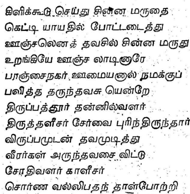 The punishment for Chinna Marudhu is little different. He was out in a cage called as Kili Koondu and it was hung from the rampart. He was starved to death. He died mediating Kaleesar and Sornavalli.