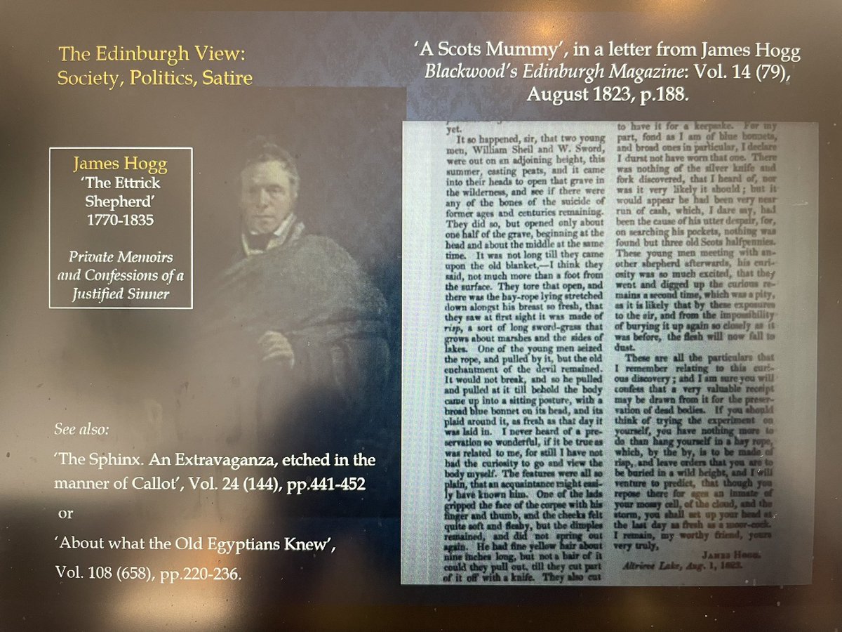 In Edinburgh, Egypt was used to further certain ideas - eg James Hogg using Egypt to get into society. Rosetta Stone has been deciphered - Egyptology becoming a discipline. Edinburgh society keeping up with the news. People showing they are fashionable & Hogg hooking into this.