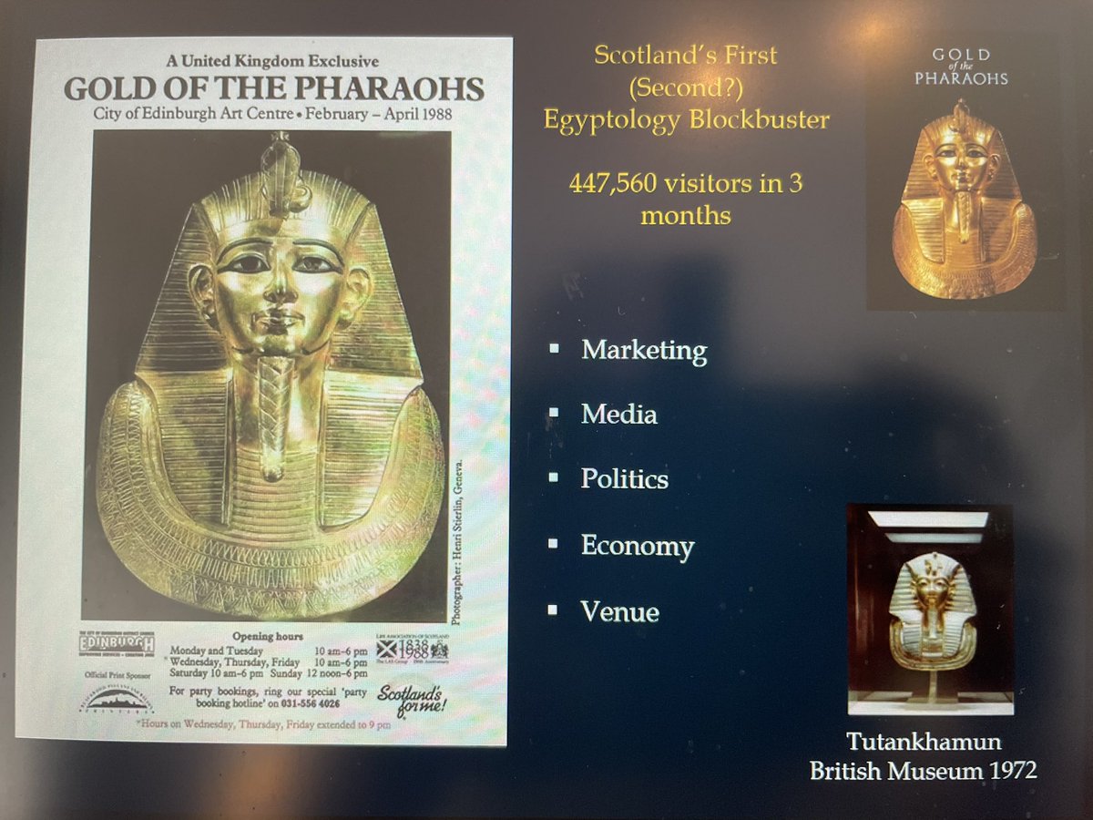 Gold of the Pharaohs - Scotland’s first/second blockbuster. Led to some of the connected (often tenuous) advertising using Egypt. Key point by Claire - Egyptomania means different things in different places. #OnwardsUpwards2022