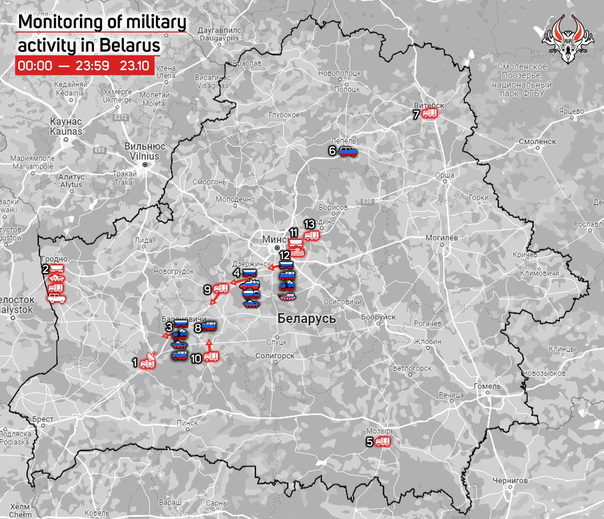 2) In the morning, an echelon of the Belarusian Armed Forces, which was being formed on October 22 at Haryn station (p.20 of the report), arrived at Hrodna railway station. The echelon included 20 Ural trucks, 30 APCs, KrAZ, 2 GAZ-66, 5 ZiL-131, UAZ-39621.
