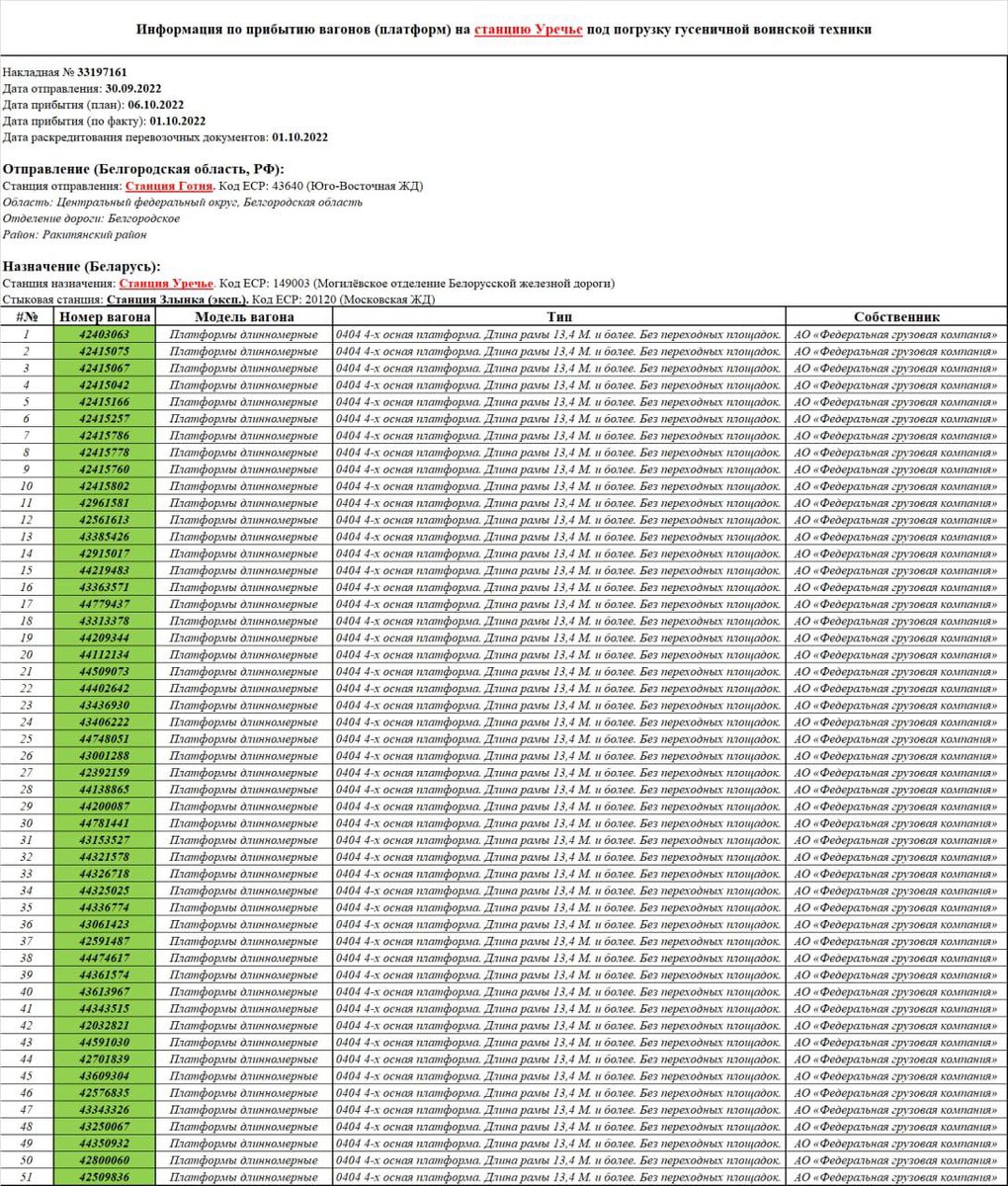On October 1, 2022, an echelon with 51 empty flatcars arrived at Urechcha railway station (Luban district, Minsk region, Belarus) from Gotnya railway station (Belgorod oblast, Russia). The 969th tank reserve base is located in Urechcha.