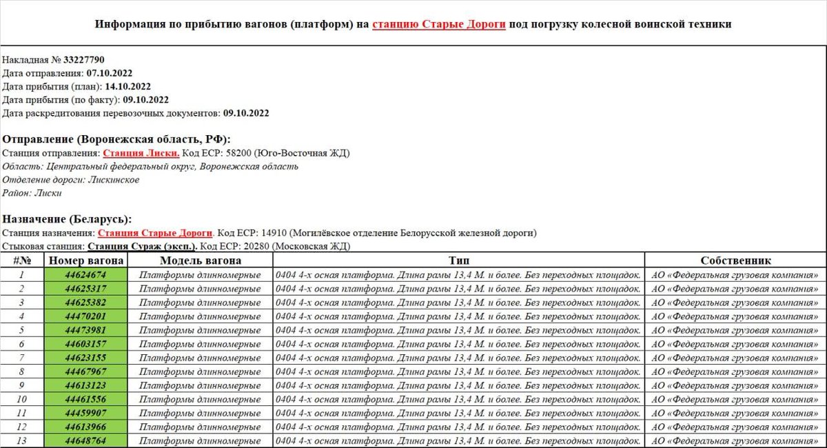 In addition, on October 9, 2022, 13 more empty flatcars arrived at Stariya Darohi railway station (Minsk region, Belarus) from Liski railway station (Voronezh oblast, Russia).