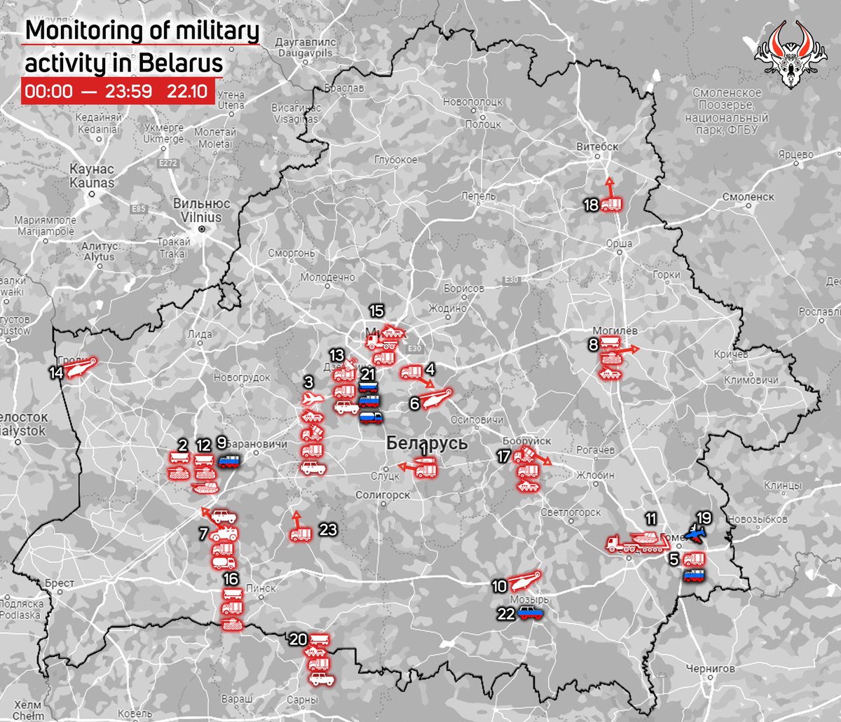 1) October 22-23. GAZ-66 (command staff vehicle R-142N) and a tilt-covered MAZ truck of the Belarusian Armed Forces were seen at the intersection of the M1 and R6 highways.
