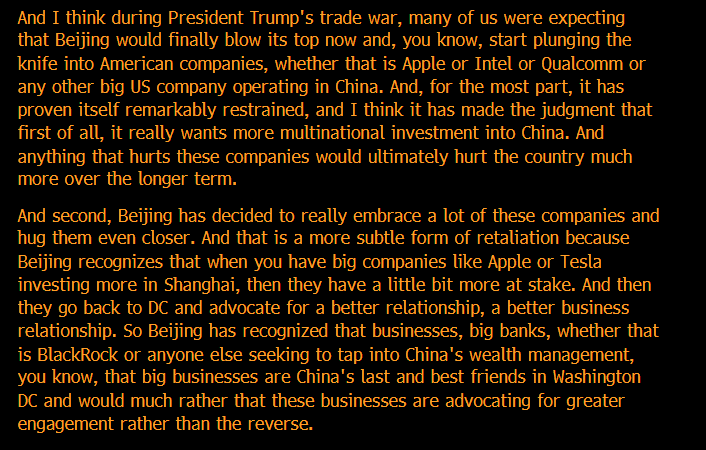 I thought this was particularly fascinating, on Beijing's strategic bearhug of US multinationals. Why retaliate, when you can instead make them your allies? bloomberg.com/news/articles/…