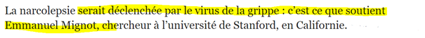 Déjà le sous-titre laisse sous-entendre un lien avéré entre narcolepsie et virus de la grippe alors que dans le corps de l’article nous lisons bien :