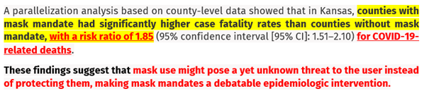 L’étude a été effectuée dans l’État du Kansas aux 🇺🇸 et a démontré que la mortalité Covid était beaucoup plus important dans les comtés ayant imposé le masque obligatoire que dans les comtés sans obligation de porter le masque.