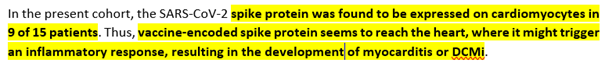 Cette étude démontre - sans équivoque - que la Spike vaccinale est exprimée dans les cardiomyocytes chez 9 des 15 patients et prouve que les nanoparticules transportant l’ARNm sont transportées dans le cœur 🫀 des vaccinés et ne restent pas dans le deltoïde 💪