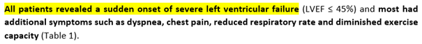 𝗧𝗼𝘂𝘀 𝗹𝗲𝘀 𝗽𝗮𝘁𝗶𝗲𝗻𝘁𝘀 ont présenté une apparition soudaine d'insuffisance ventriculaire gauche sévère et la plupart présentaient des symptômes supplémentaires tels que dyspnée, douleur thoracique, fréquence respiratoire réduite et capacité d'exercice réduite.