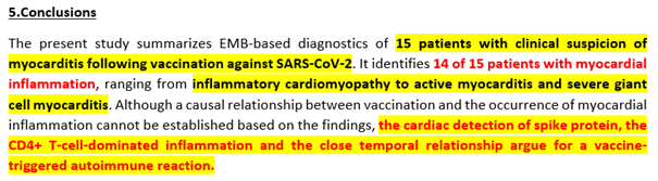 Les auteurs ont aussi exclu toute infection virale comme pouvant être la cause des réactions inflammatoires cardiaques, ne laissant comme option que la réaction auto-immune provoquée par la Spike vaccinale !