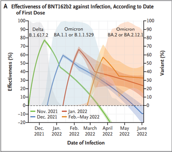 Quel que soit le variant, l’ « l’efficacité » chez ceux jamais infectés, est à son maximum après plus d’un mois et chute rapidement pour devenir négative après 4 mois, mettant donc en danger ces enfants !