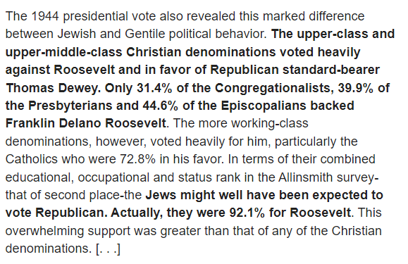 In general, if ranking early 20th century American white ethnic groups from most leftist to most rightist, you'd get something like: