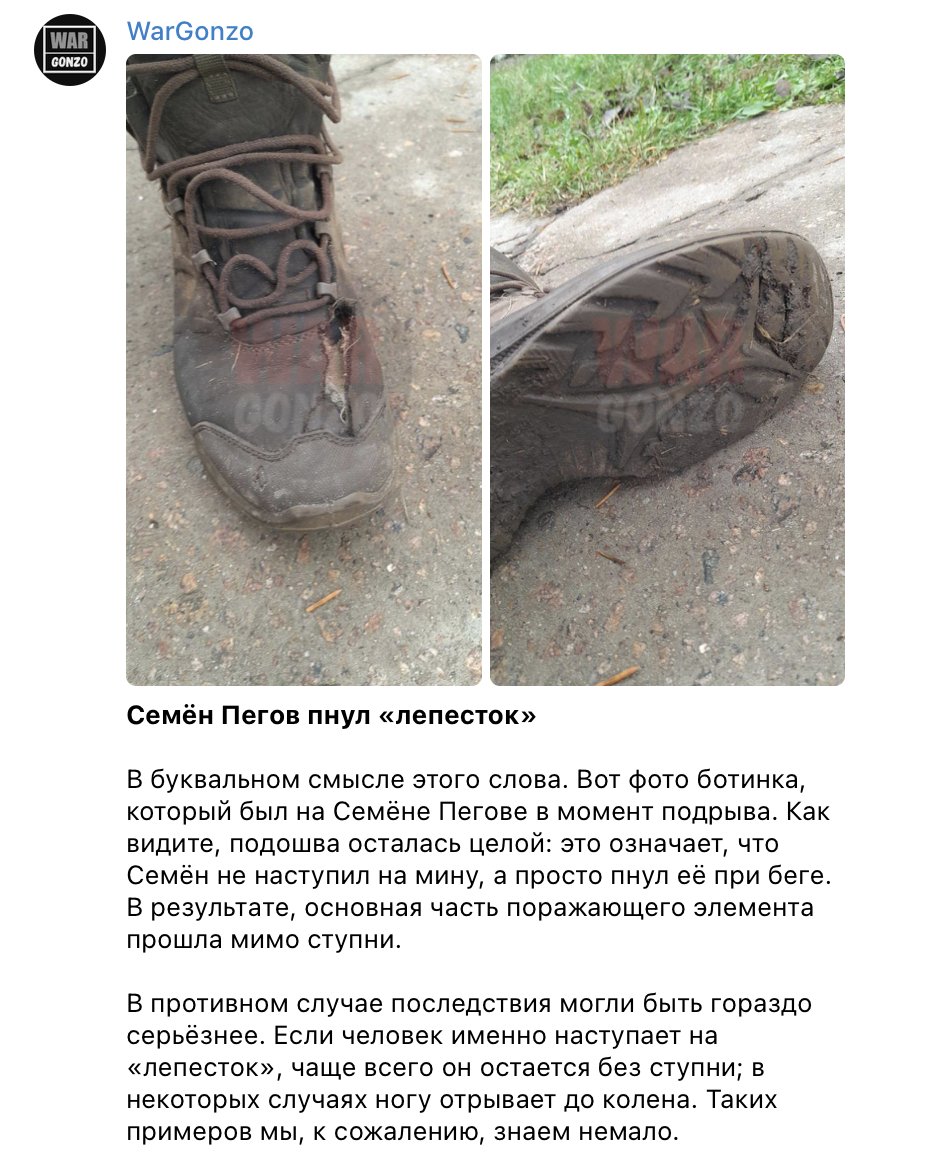 Небольшой апдейт. Пишут что Пегов "пнул" лепесток, поэтому взрыв был не под ногой. Ну оооок, может быть. Хотя я все равно сомневаюсь, да и порез на ботинке похож на результат осколка, а не взрыва.
