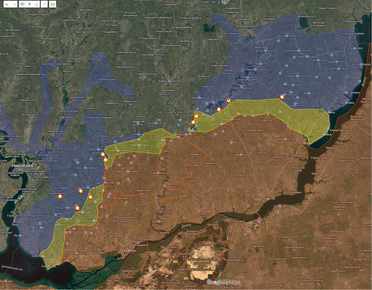 Карта примерной ситуации на местности в Украине по состоянию на 00:00 UTC 25.10.22. (события за 24.10.22, 243 день полномасштабной войны) + дайджест событий. Сводка составлена на основании компиляций аналитики OSINT исследователей и сводок Генштаба.