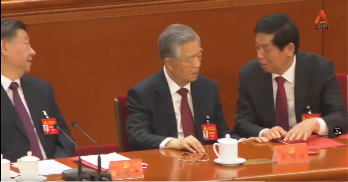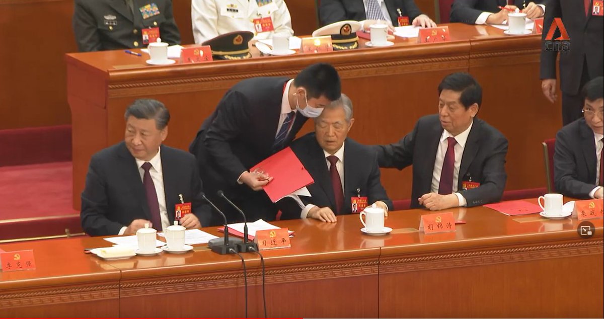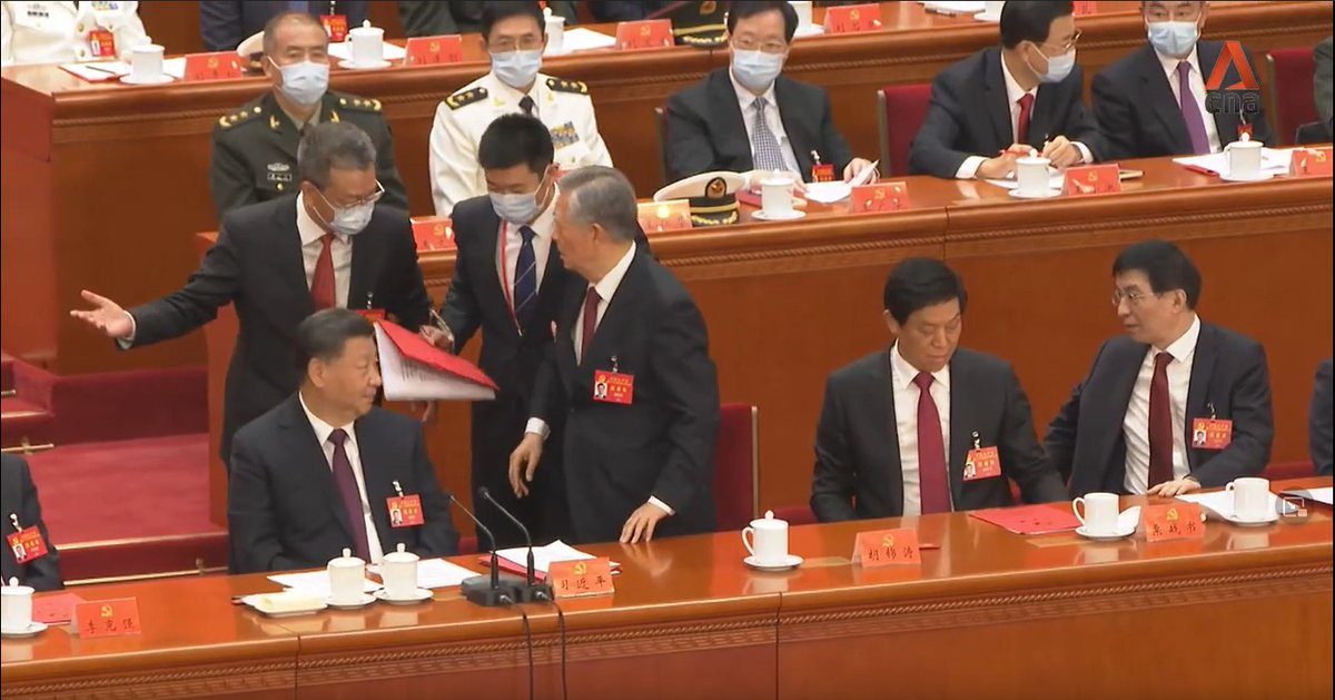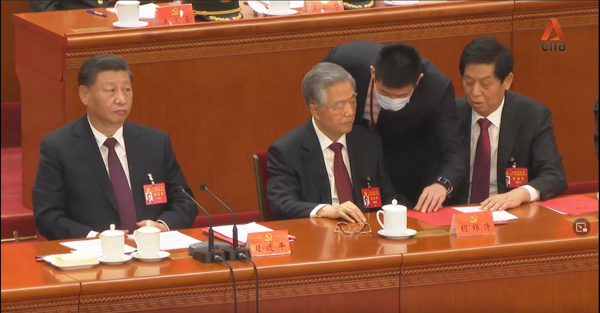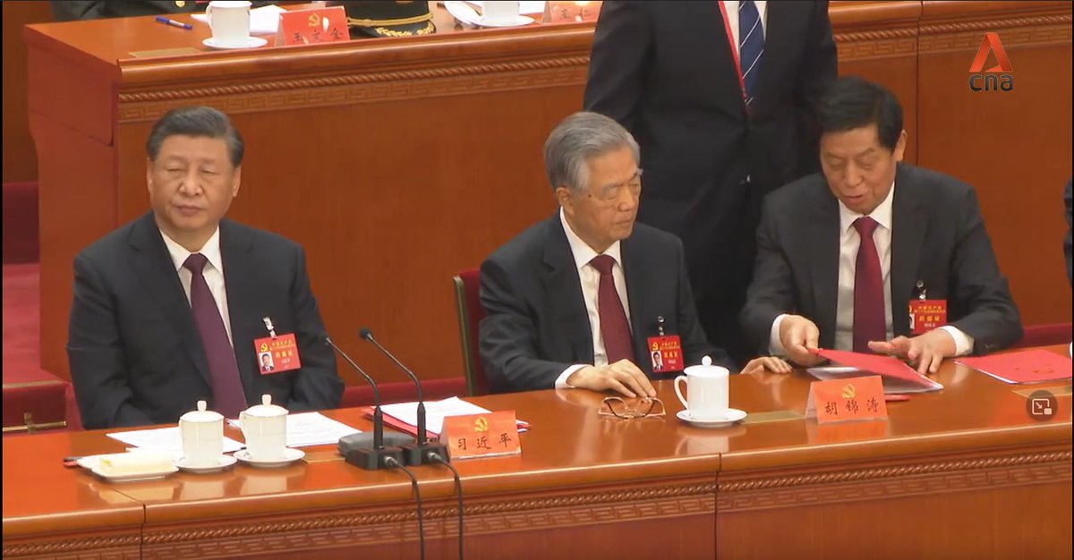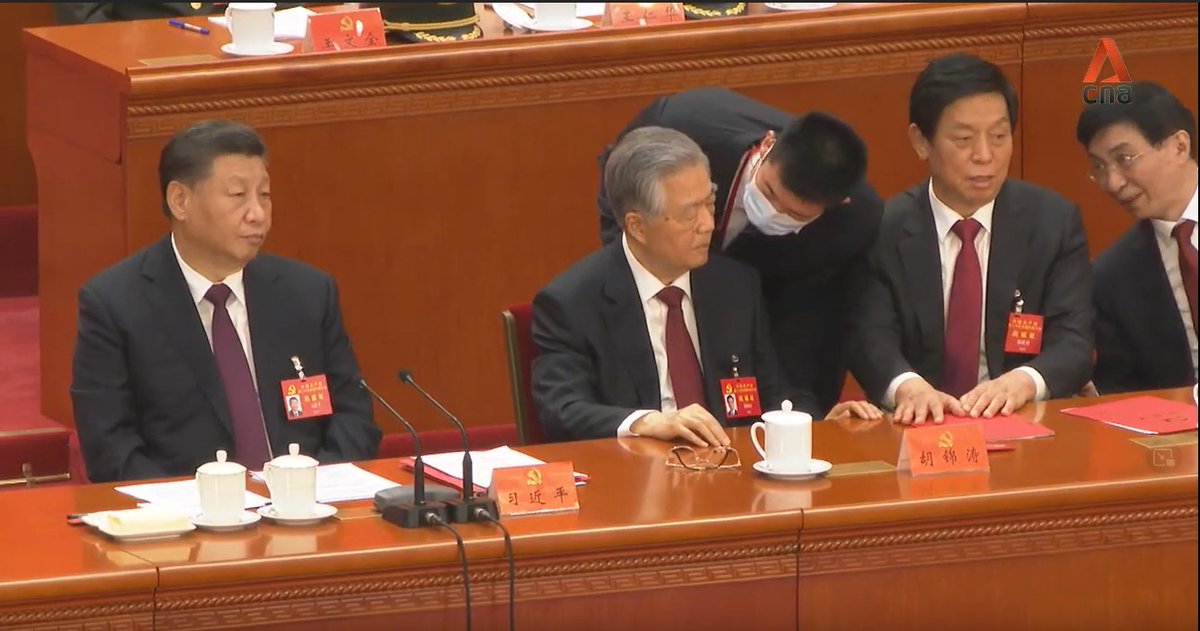 A thread on the key moments: 1/ Current Chairman of China’s legislature, Li Zhanshu, is seen taking papers out of Mr Hu’s hand, arranging it and placing it back on the table, while leaning in and speaking to him