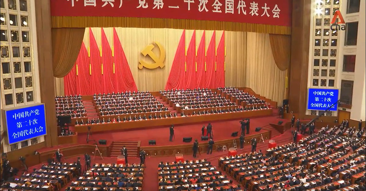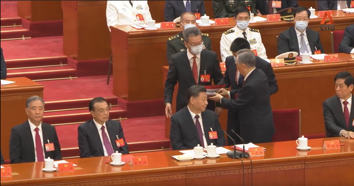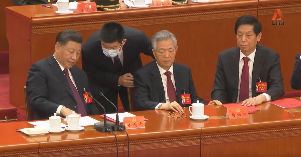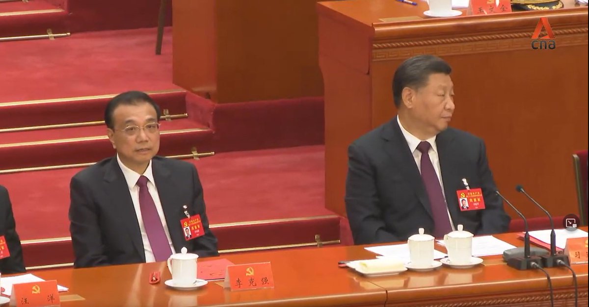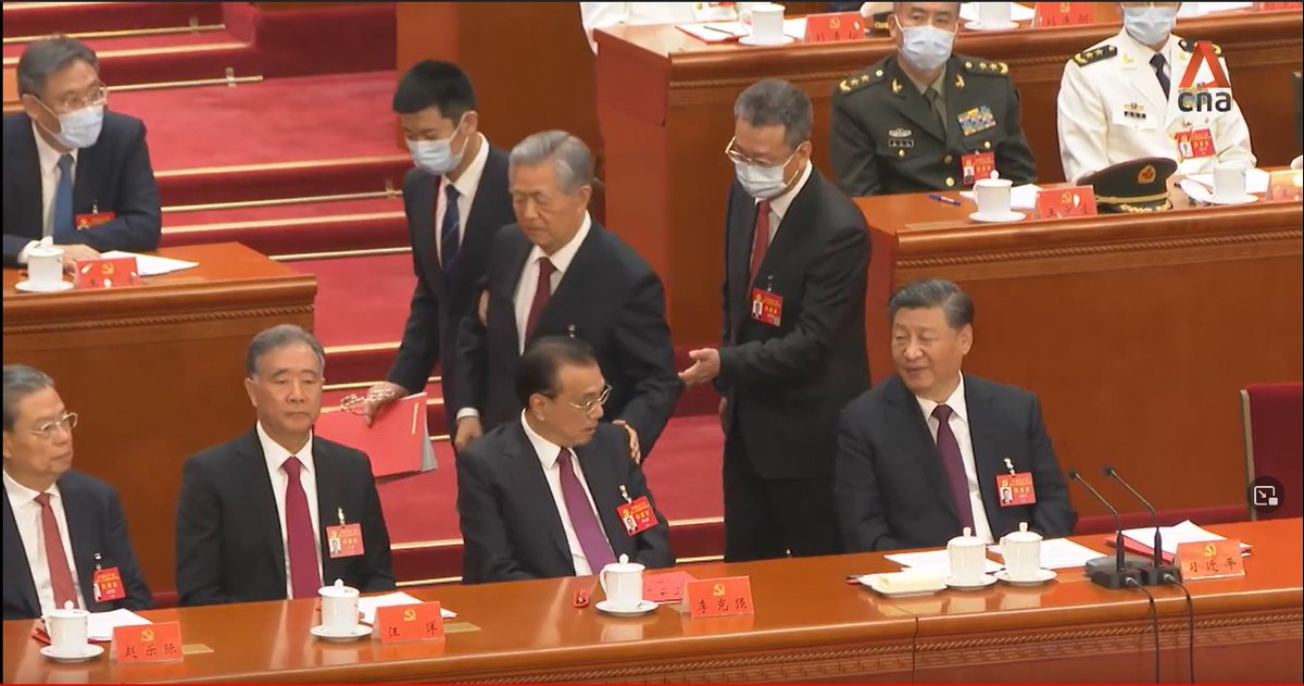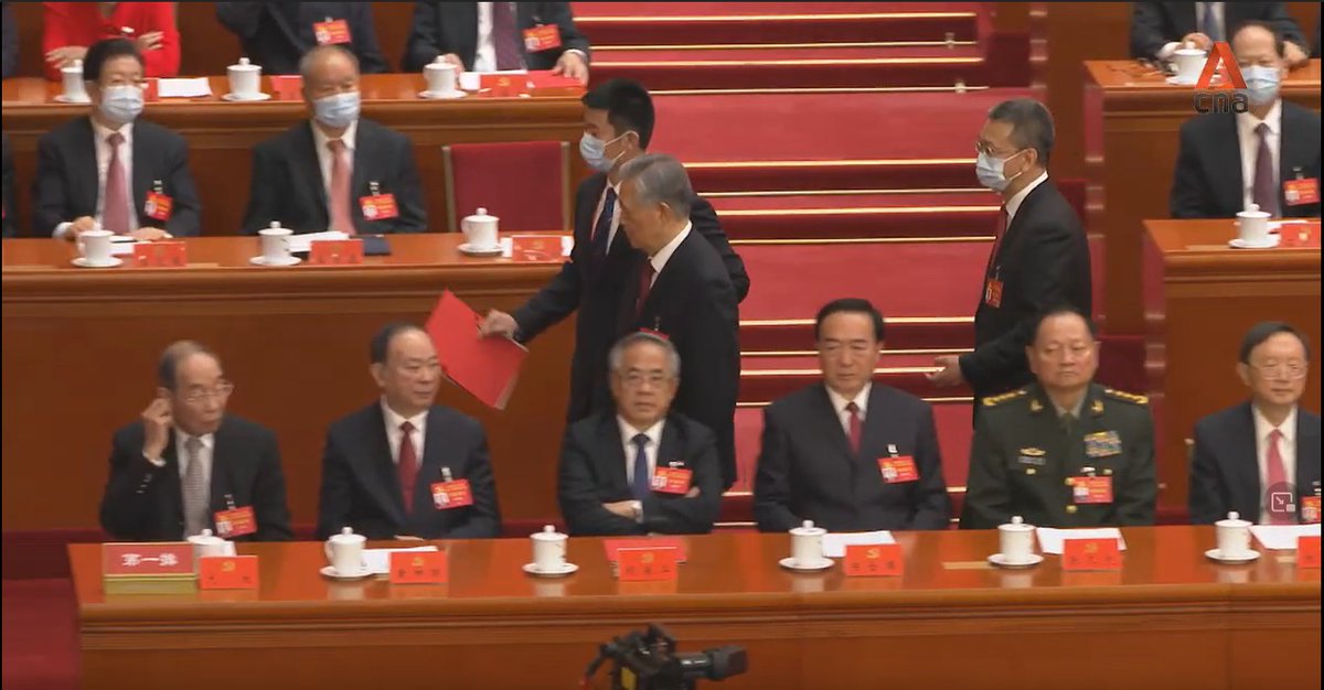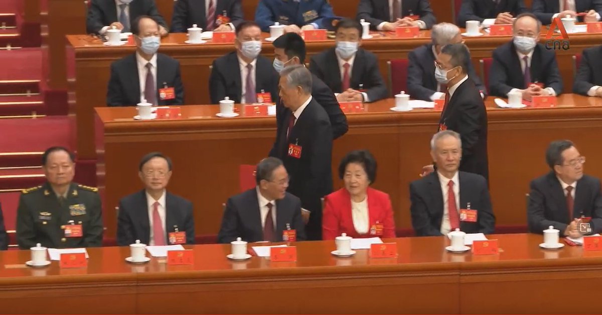 A thread on the key moments: 1/ Current Chairman of China’s legislature, Li Zhanshu, is seen taking papers out of Mr Hu’s hand, arranging it and placing it back on the table, while leaning in and speaking to him