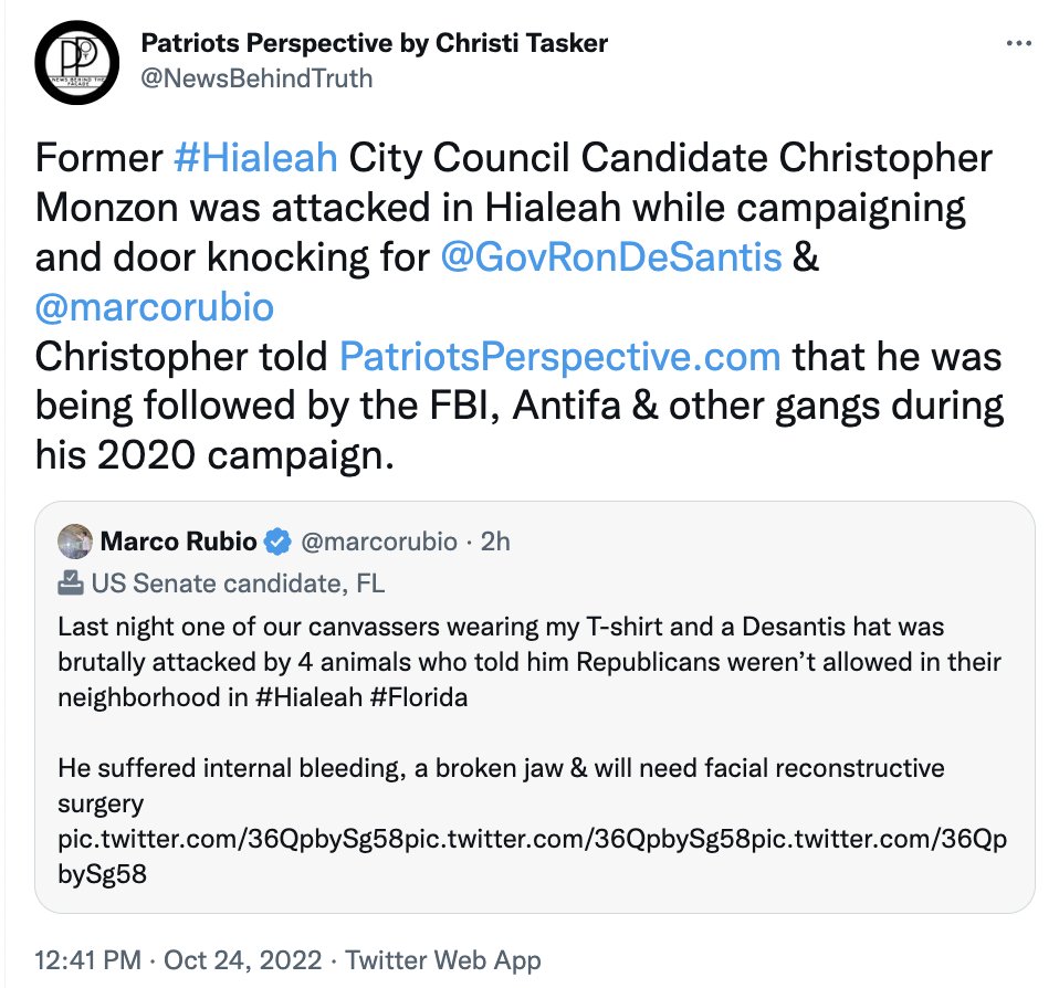 With high confidence we are calling that the @marcorubio canvasser who was attacked + hospitalized last night was Christopher Monzon aka the “Cuban Confederate” who has a well documented history of advocating white supremacy — AND deep involvement in Miami GOP politics.