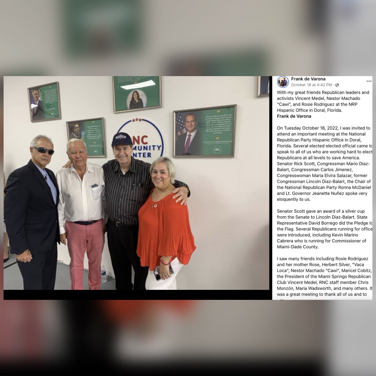 President of the Miami Springs Republican Club "Vince Medel" -- more commonly known as Vincent Medel -- appears to be the source of the "politically motivated attack" narrative.