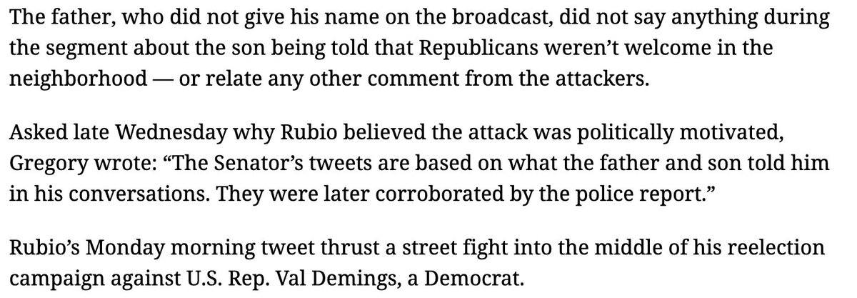 Based on the police report, which has no mention of political motivations for the attack, local media including @MiamiNewTimes and @WPLGLocal10 are questioning the narrative of Marco Rubio's post.