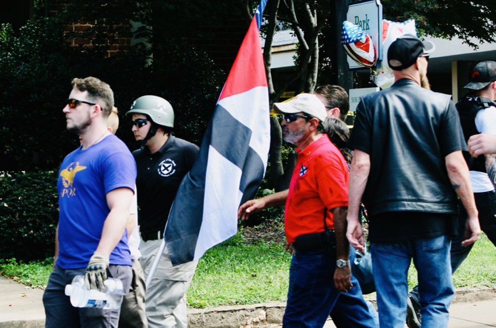 Yet another photo uncovered of Christopher Monzon marching together at the 2017 Unite the Right white supremacist rally as part of the neo-confederate League of the South contingent.