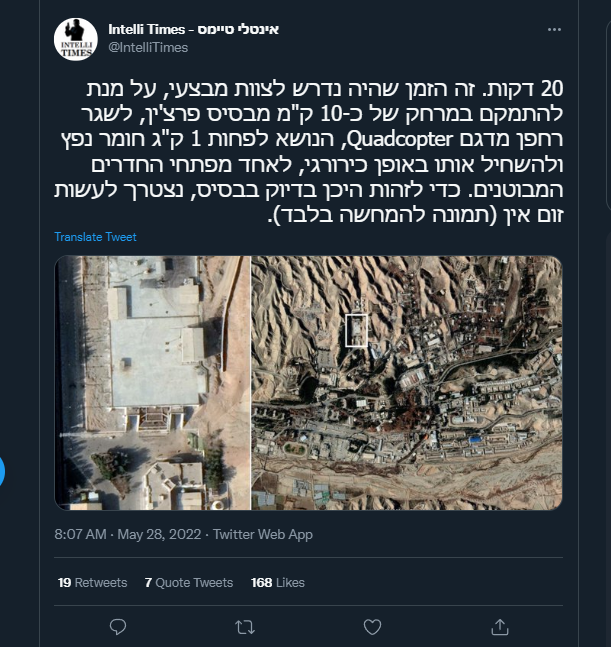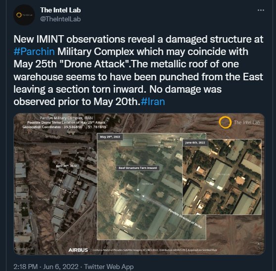 سر نخ بعدی ما برای پیدا کردن محل انفجار دوباره به یک اکانت شبه رسمی اسراییل در توییتر برمیگرده. چند ساعت بعد از خبر انفجار یک اکانت اسراییلی ادعا کرد که این انفجار در یک ساختمان بزرگ و عجیب در شمال سایت اصلی پارچین صورت گرفته/
