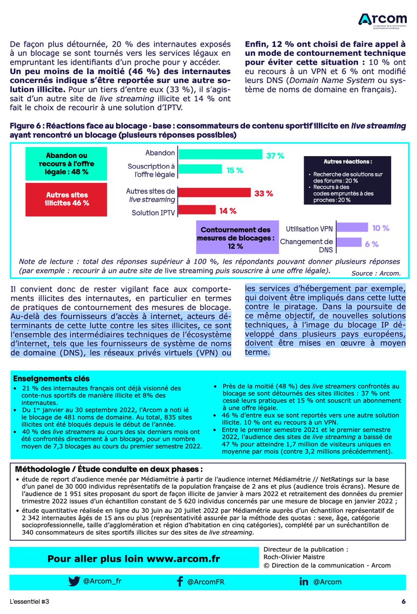 Et pour aller plus loin, en attendant la publication du rapport complet, la synthèse de l'étude de l'@Arcom_fr sur l'impact du blocage des services illicites de contenus sportifs est consultable ici⬇️ arcom.fr/nos-ressources…