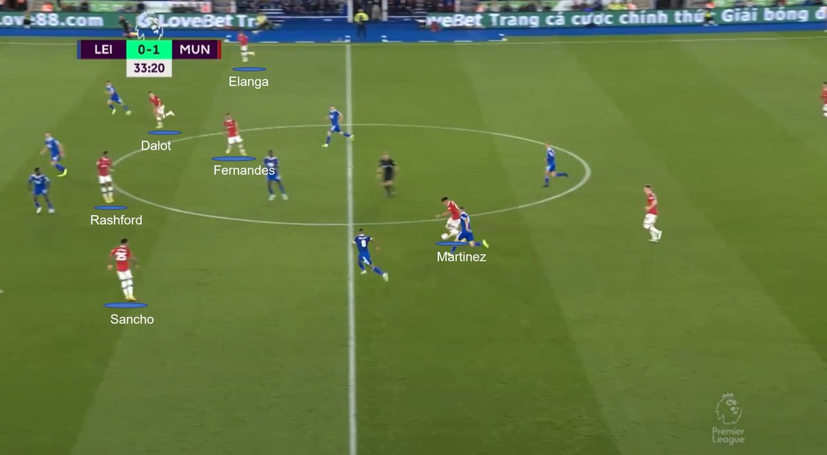 For the first 35 mins Martinez could use his excellent ability to pass progressively through the lines to find a spare midfielder, with no attacker picking up any of the midfield 3 and simultaneously Loftus Cheek and Jorginho finding it difficult to stick to Eriksen or Fernandes
