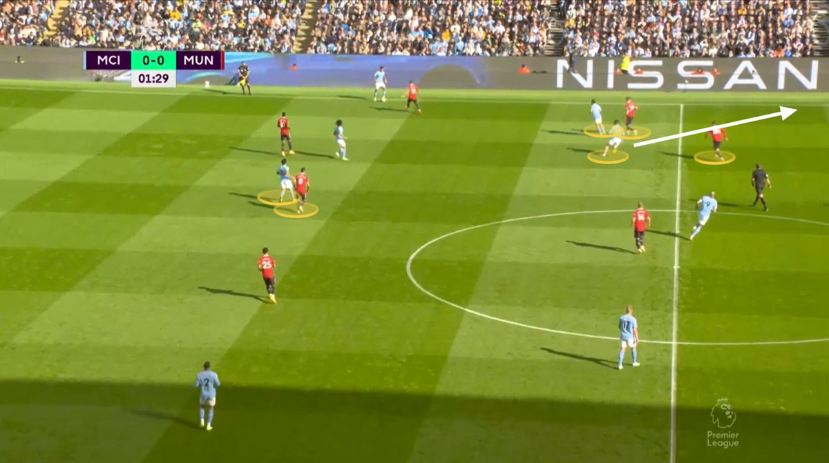 United had problems basically from the 1st minute, as I think the plan was for Fernandes to stick with Gundogan as the single pivot and Mctominay to stick with Bernardo, the problem is Bernardo positionally rotates on the left a lot dragging Mctominay out of position