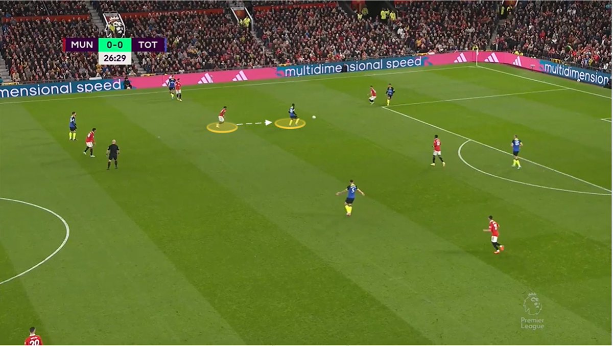 United's pressing and man to man pressing never allowed Spurs to get an attack going. When the ball is played into Bissouma Fred is quick to close him down so he has no way to release Kane/Son or even pass to another midfielder or full-back because the space has been squeezed
