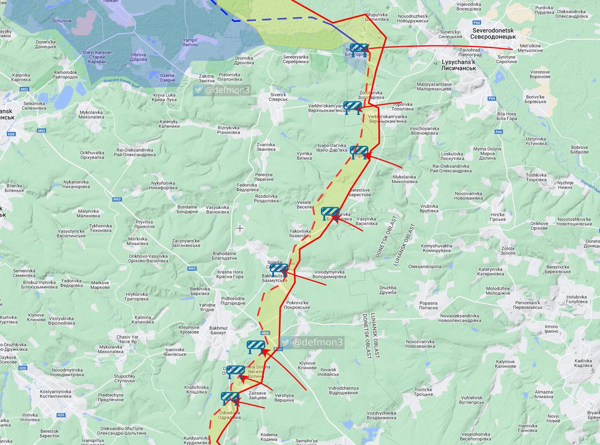 Bakhmut,, Verkhnyokamianske, Ivangrad, Klishchiivka, Spirne, Soledar, Maryinka and Nevelske.