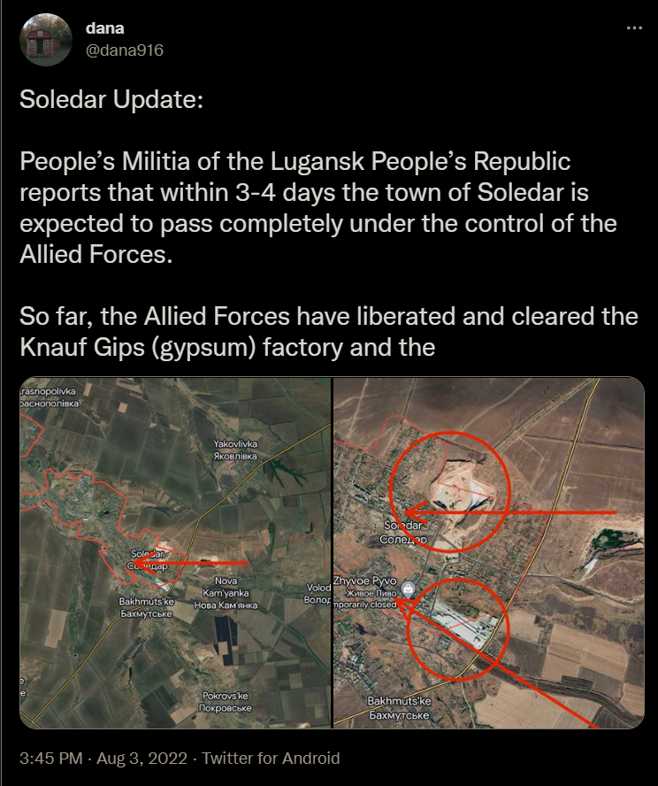 Russian RIA reported the RU offensive is moving forward in this area. They reported this from the Knauf factory, which they reportedly captured at August 3rd.