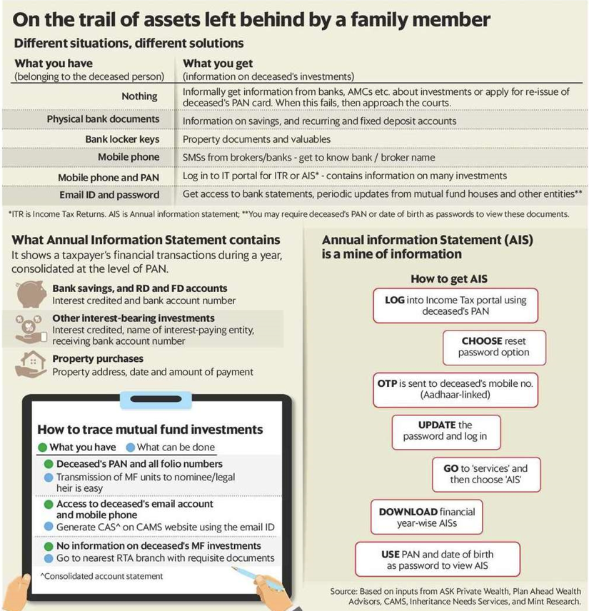 1) Look for a doc that would have most of the person's assets. For example, the Annual Information Statement (AIS) which can be accessed through the Income Tax Portal. However for that you need to know the deceased's PAN and have access to their Aadhar-linked mobile phone