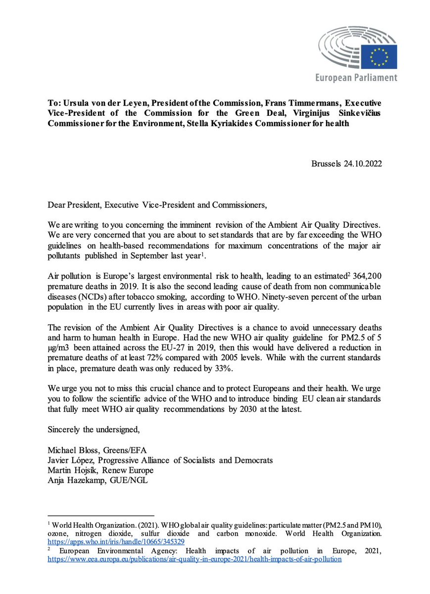 In einem Brief fordere ich mit anderen Fraktionen (S&D & Co) die Grenzwerte ernst zu nehemn. >350.000 Todesfälle pro Jahr sind inakzeptabel. michaelbloss.eu/de/presse/them…
