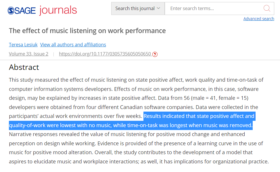 "Results indicated that state positive affect and quality-of-work were lowest with no music, while time-on-task was longest when music was removed."