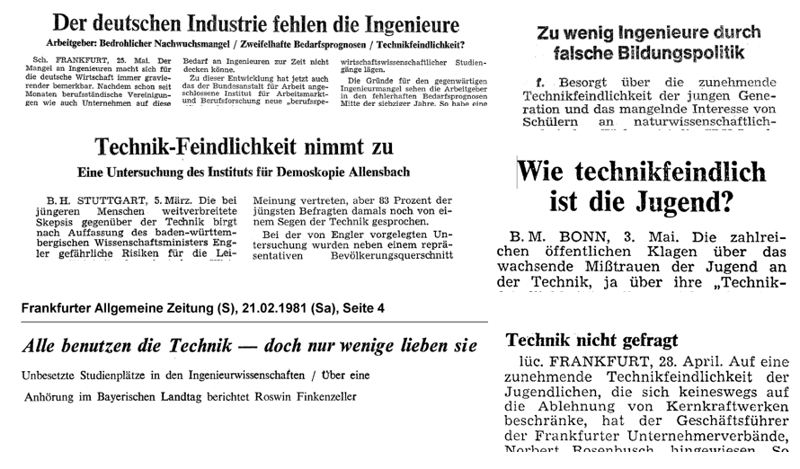 Es gab einen größeren Methodenstreit in der Umfrageforschung, da ein Institut beharrlich "Technikfeindlichkeit" diagnostizierte und alle anderen ihm widersprachen. Es gab unzählige Bücher, Podiumsveranstaltungen - und auf Dauer auch immer mehr Studien (die meisten sehr kritisch).