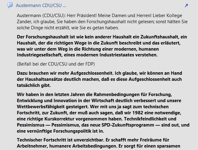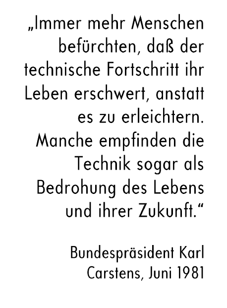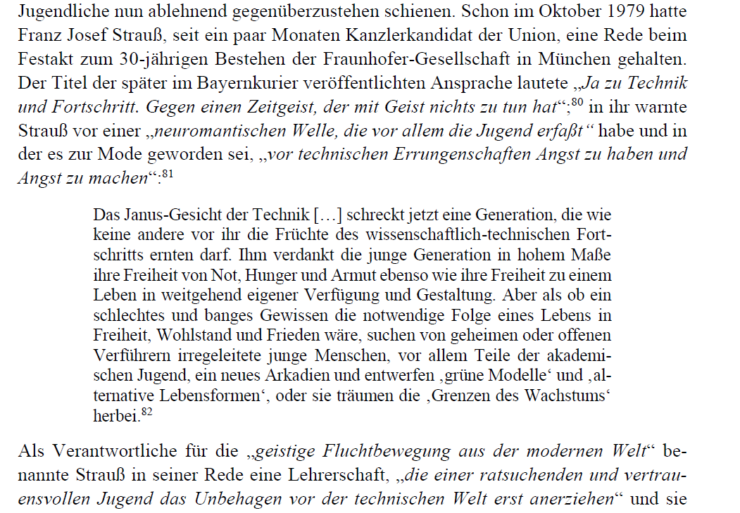 Vor einer zunehmenden “Technikfeindlichkeit” warnten vor allem Politiker*innen aus der konservativen Opposition. Besonders wichtig war das Thema beispielsweise für Franz Josef Strauß, damals bayerischer Ministerpräsident, der es schon seit Ende der 1970er beackerte: