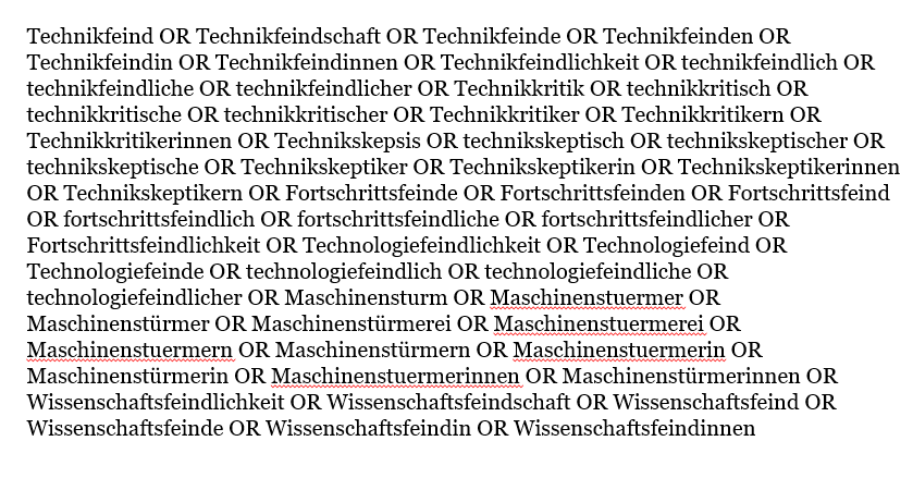 Wahlweise mittels Boole'scher Operatoren - oder mit Asterisken ("technikfeind*" - "technikkrit*" -"wissenschaftsfeind*") - je nachdem, was das entsprechende Onlinearchiv zulässt.