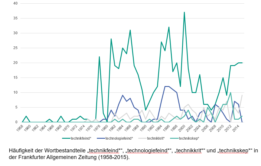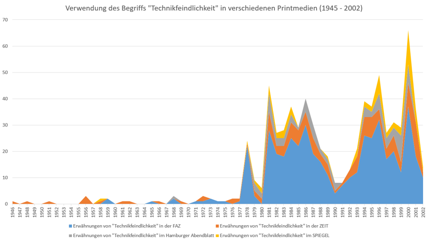 Bei den Treffern nach 1990 fällt auf, dass sie meist nichts mehr mit der ursprünglichen Debatte zu tun haben. “Technikfeindlichkeit” ist nun so weit im Sprachgebrauch etabliert, dass der Begriff außerhalb seines ursprünglichen Kontextes verwendet werden kann.