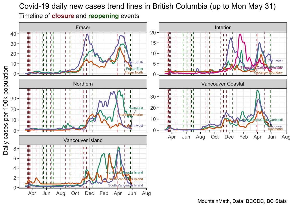The strong decline is seen across all health regions, most clustering around 5 cases per 100k pop a day with Vancouver Island well below that.