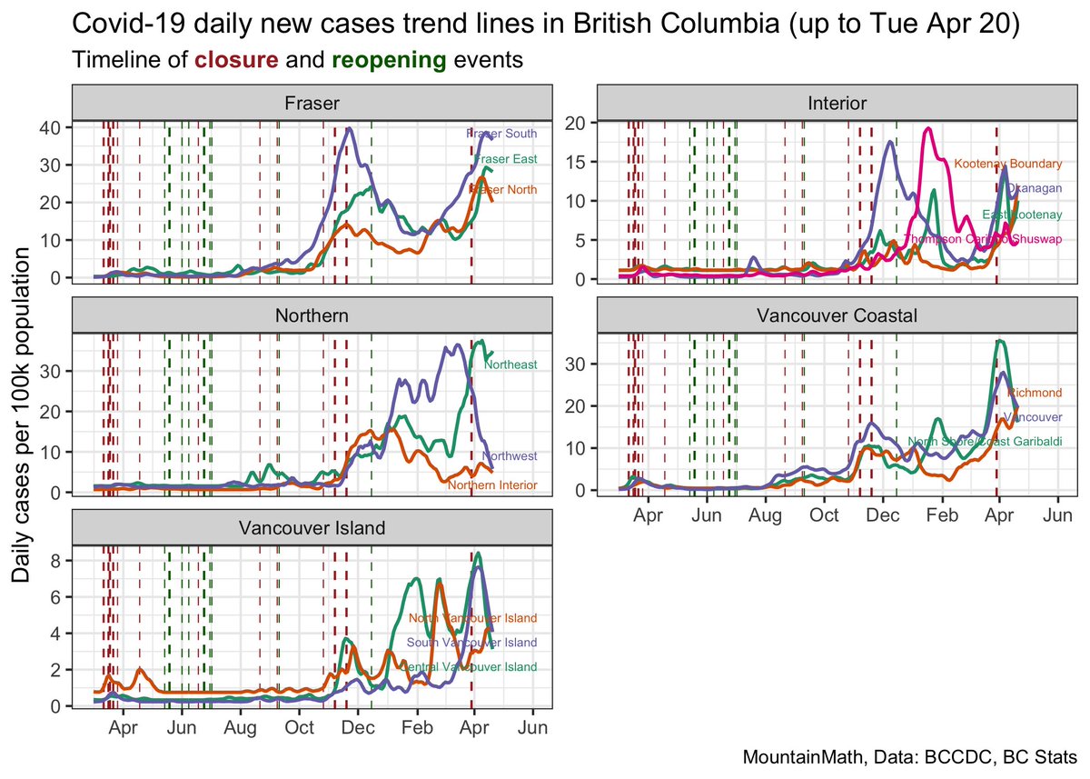 Still lots of volatility across Health Regions, but good to see all Fraser regions have stopped growing. Hard to interpret this without better understanding of regional VOC share, as well as updated overall VOC share and split. We still are still missing basic VOC data in BC.