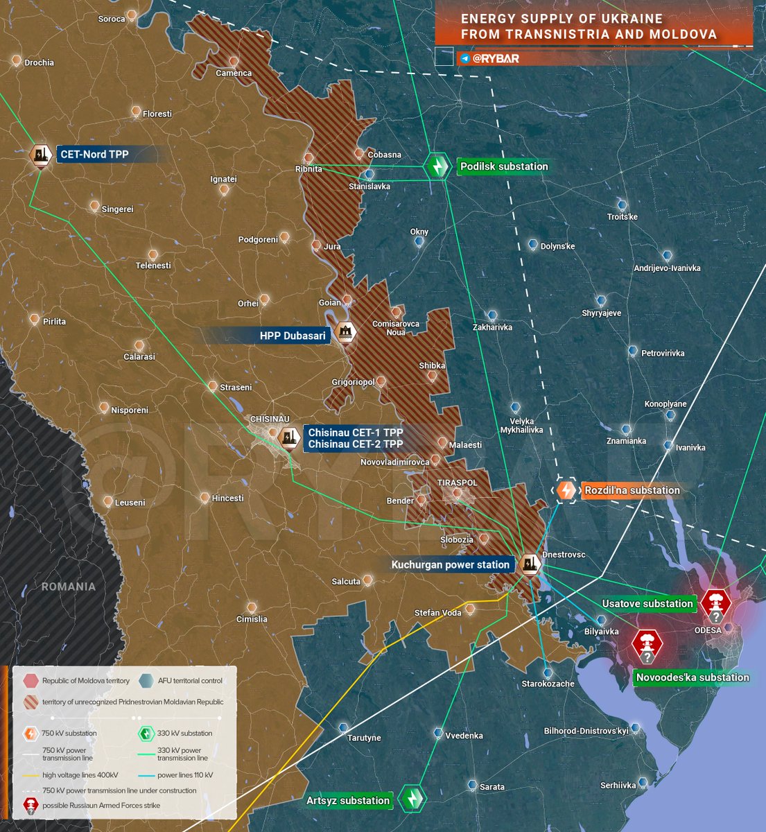 On the territory of Transnistria there is a large thermal power plant - the Moldavskaya TPP. From its open switchgear there is a 400 kV high-voltage line to Romania, as well as a 330 kV high-voltage line to Moldovan-controlled territory, to Ukraine, and Transnistria itself.