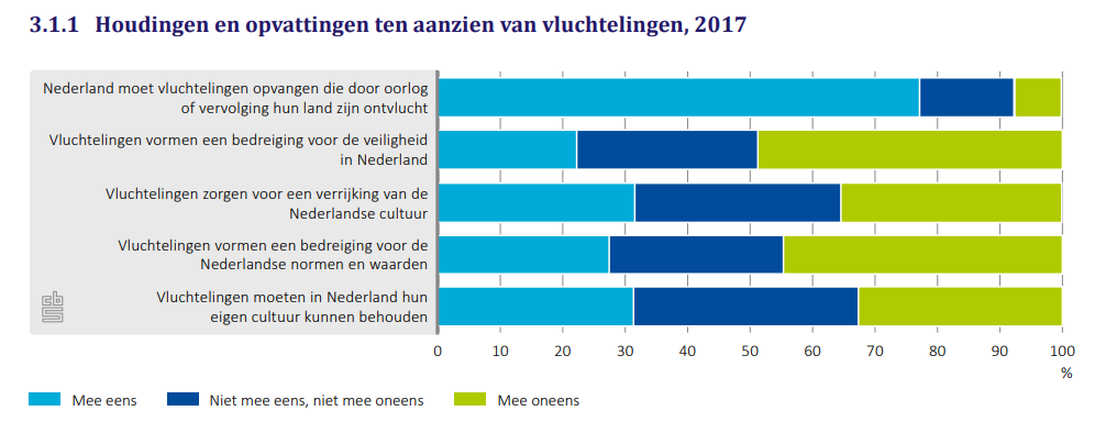 Een substantieel aandeel maakte zich ook zorgen. Ruim 20% gaf aan dat vluchtelingen een bedreiging vormen voor de veiligheid in Nederland. Bijna 30% zag vluchtelingen als bedreiging voor de Nederlandse normen en waarden.