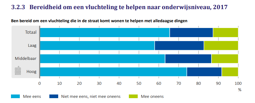 Kwam het dichterbij, dan was men gemiddeld zeer positief. Op de vraag of mensen vluchtelingen die in hun straat komen te wonen met alledaagse dingen willen helpen zegt ⅔ ja. Maar iets meer dan 10% zegt nee.