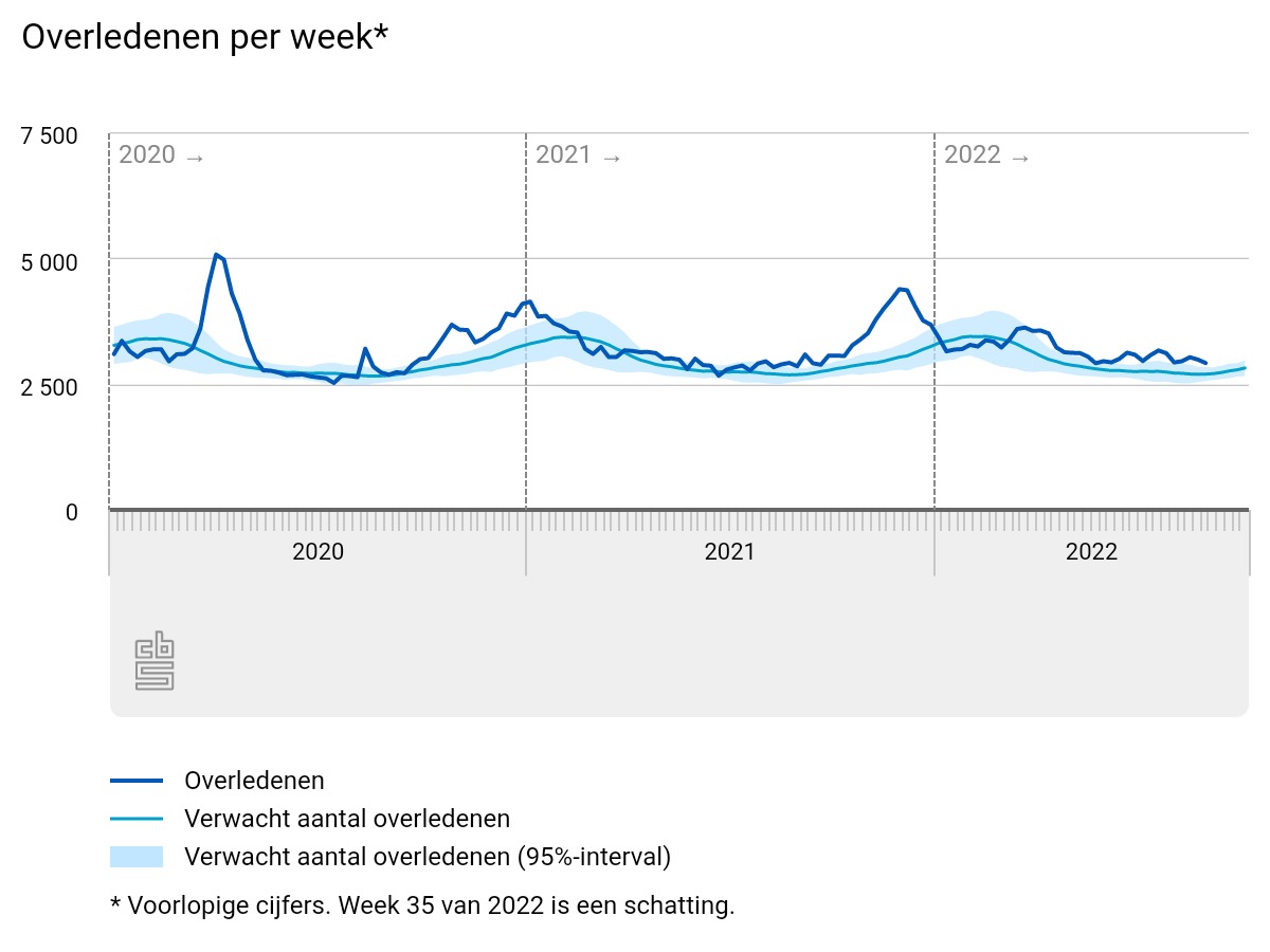 CBS: In week 35 (29 aug-4 sept) overleden ruim 2900 mensen, net iets minder dan in de week ervoor (2993). In heel augustus overleden ~1300 meer mensen dan verwacht: #oversterfte. De sterfte was vooral hoger onder Wlz-zorggebruikers en 80-plussers. cbs.nl/nl-nl/nieuws/2…