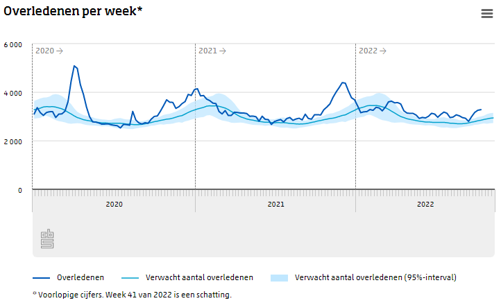 CBS: In week 42 (17 t/m 23 okt) overleden ruim 3300 mensen, bijna 450 meer dan verwacht voor deze week, er is weer oversterfte, vooral onder 65-plussers. @statistiekcbs cbs.nl/nl-nl/maatwerk…