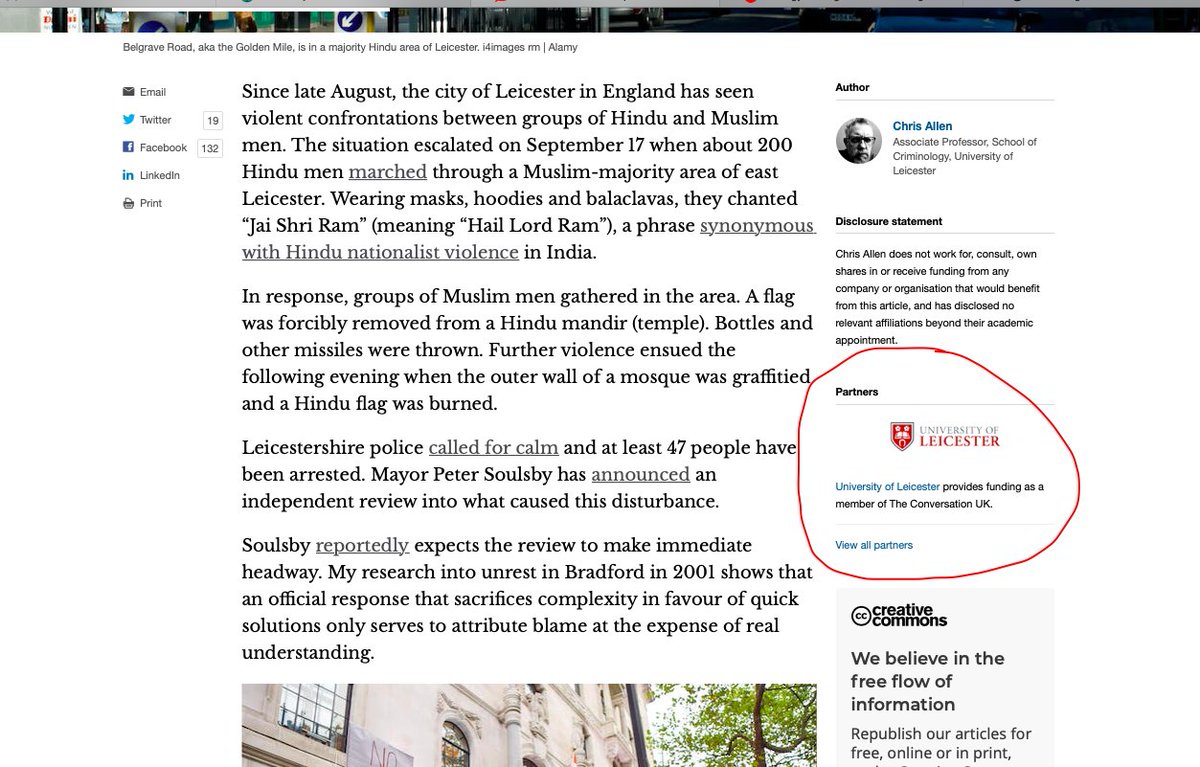4. University of Leicester is partner of the news portal The Conversation UK. The @CityMayorLeic has also blamed #Hindus for the violence after meeting ex-recruiter of ISIS/AQ, Majid Freeman.