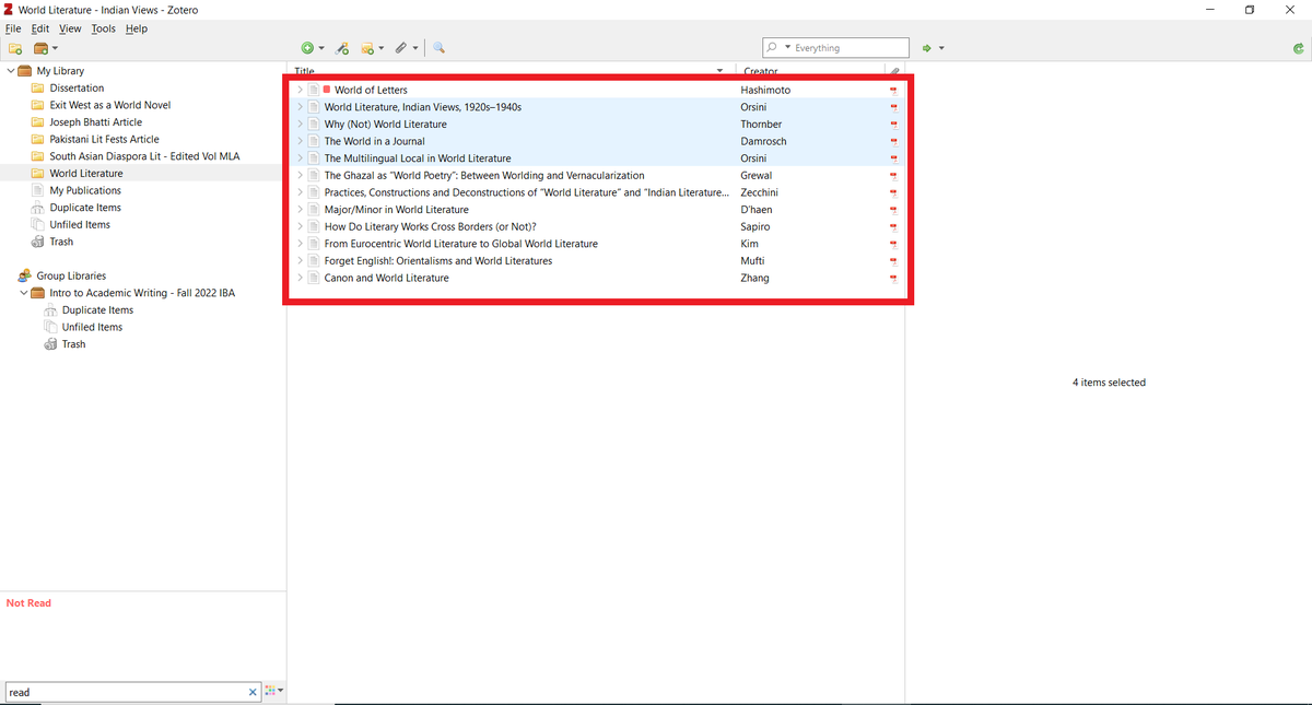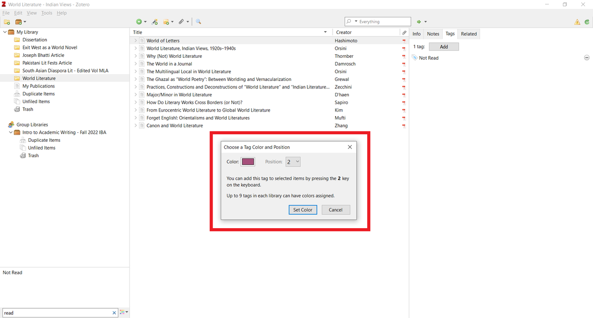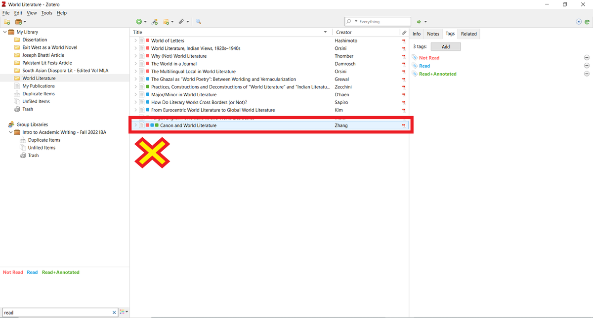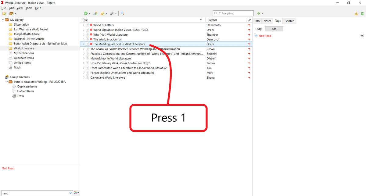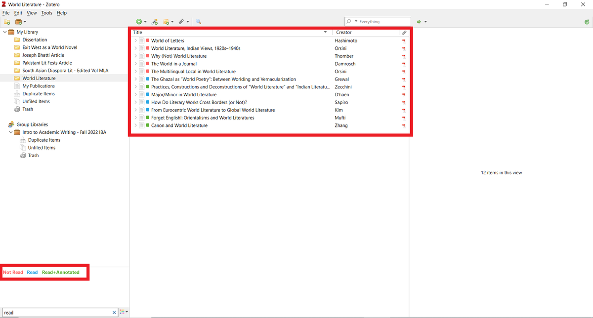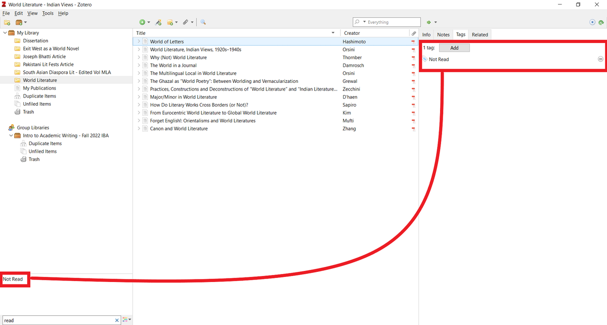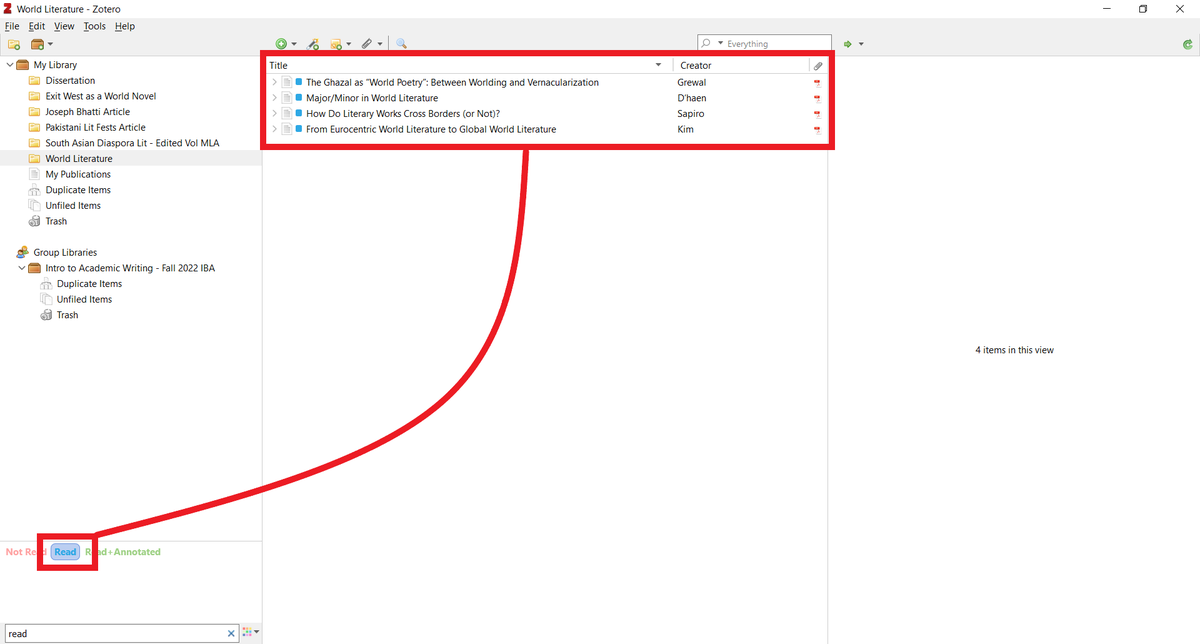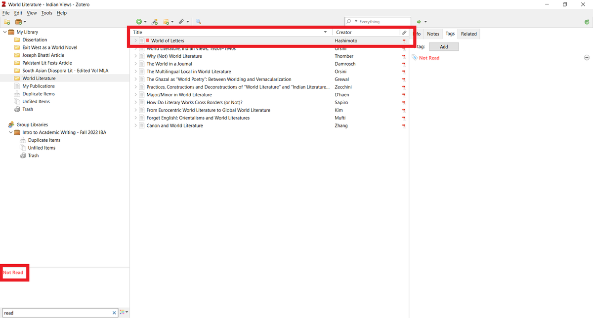 Now if you want to see all the items you have read, simply click on the "Read" tag in the bottom-left corner and Zotero will show you all items marked "Read."